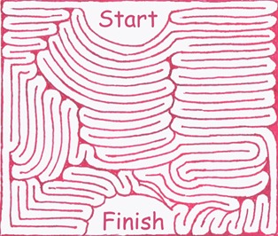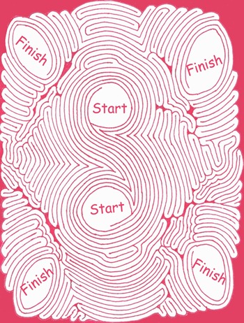 I started this maze by simply drawing a random “swirly” line and moving on from there. Sometimes the best techniques are the simplest. Anyway, there is only one “start” and one “finish”. Have fun.